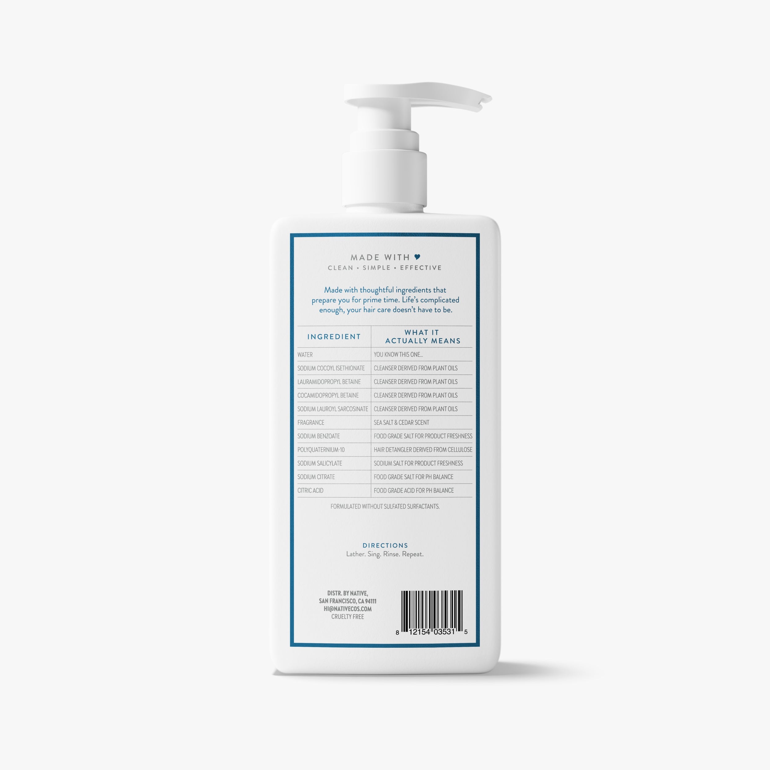 Water, Sodium Cocoyl Isethionate, Lauramidopropyl Betaine, Cocamidopropyl Betaine, Sodium Lauroyl Sarcosinate, Fragrance, Sodium Benzoate, Polyquaternium-10, Sodium Salicylate, Sodium Citrate, Citric Acid.
