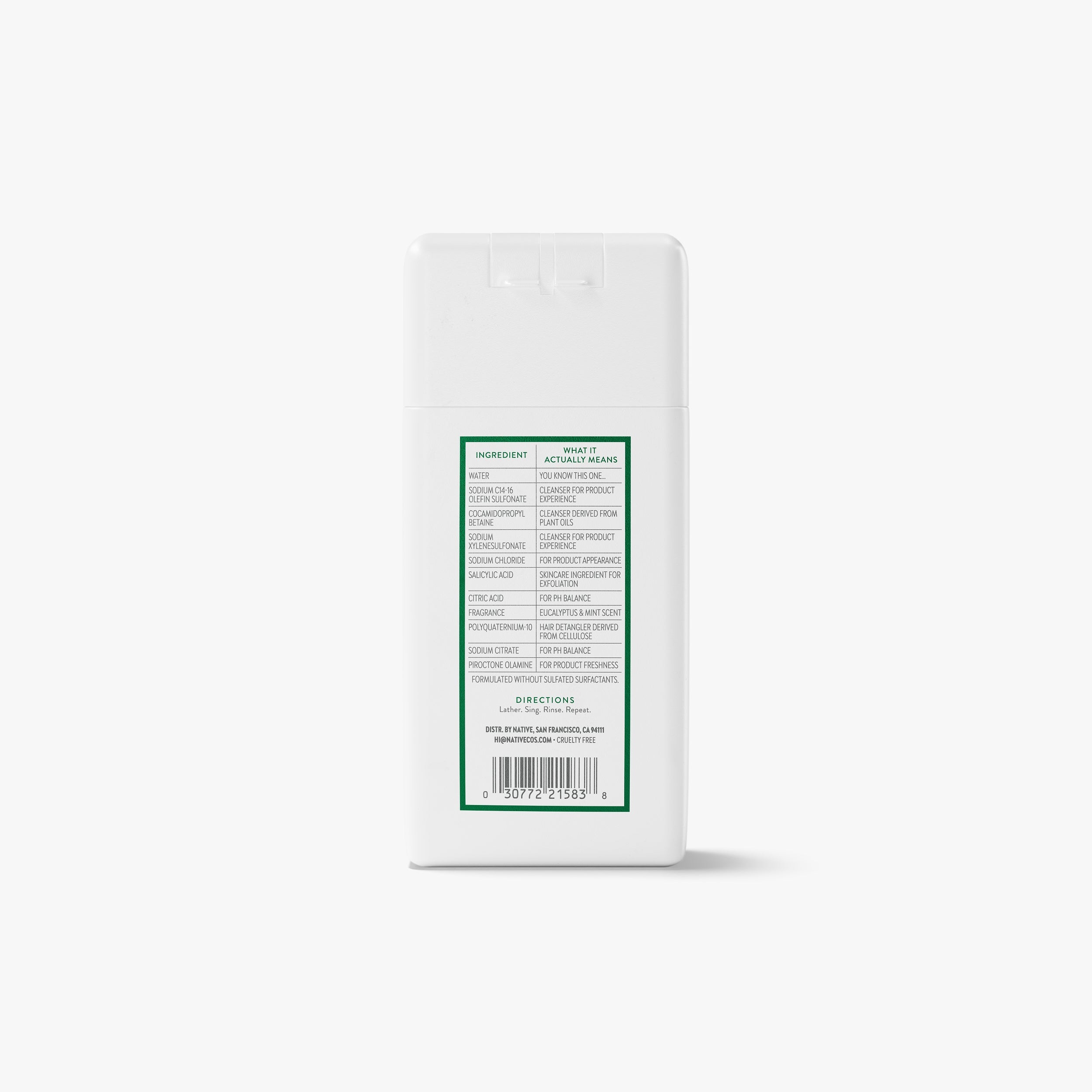 Water, Sodium C14-16 Olefin Sulfonate, Cocamidopropyl Betaine, Sodium Xylenesulfonate, Sodium Chloride, Salicylic Acid, Citric Acid, Fragrance, Polyquaternium-10, Sodium Citrate, Piroctone Olamine.