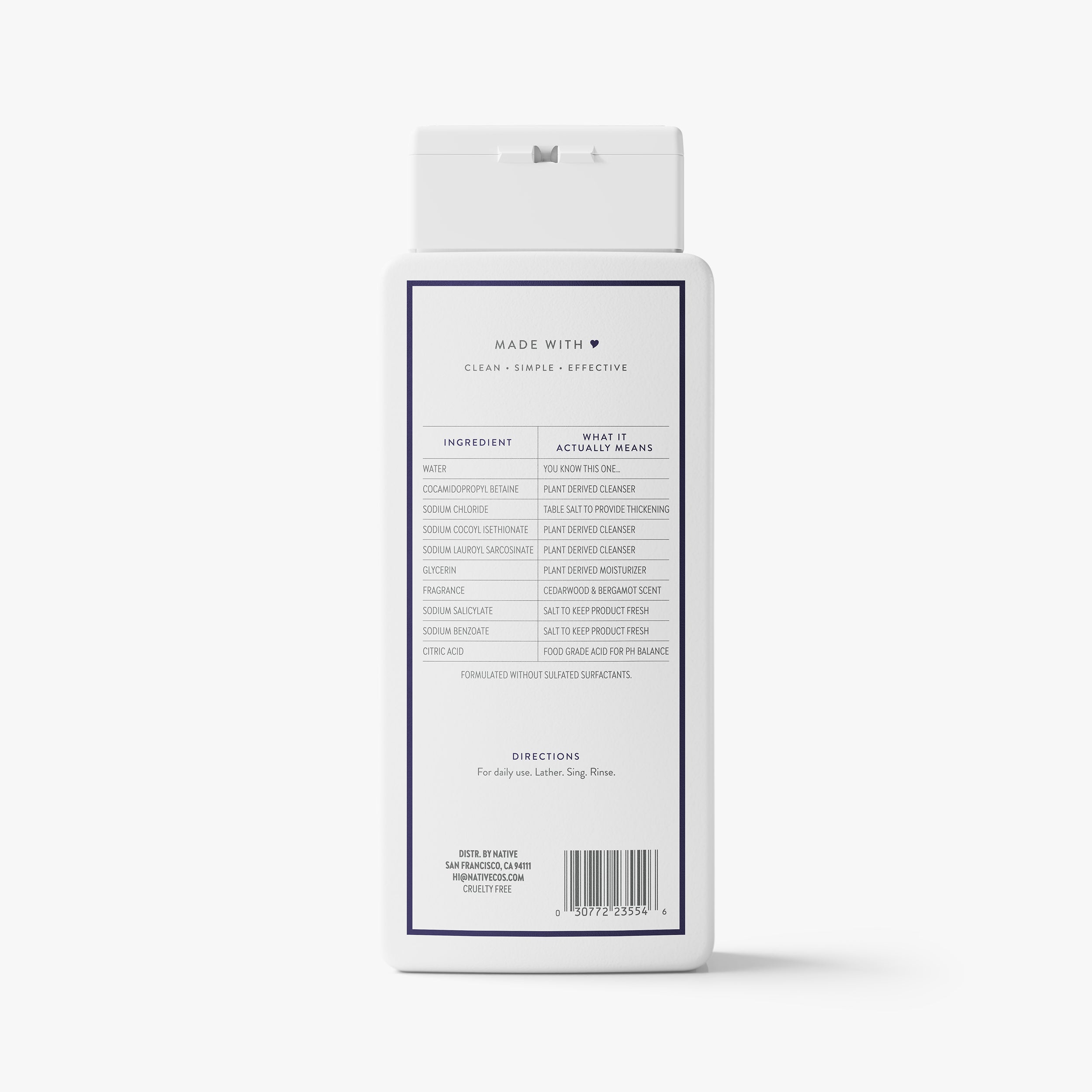 Water, Cocamidopropyl Betaine, Sodium Chloride, Sodium Cocoyl Isethionate, Sodium Lauroyl Sarcosinate, Glycerin, Fragrance, Sodium Salicylate, Sodium Benzoate, Citric Acid.
