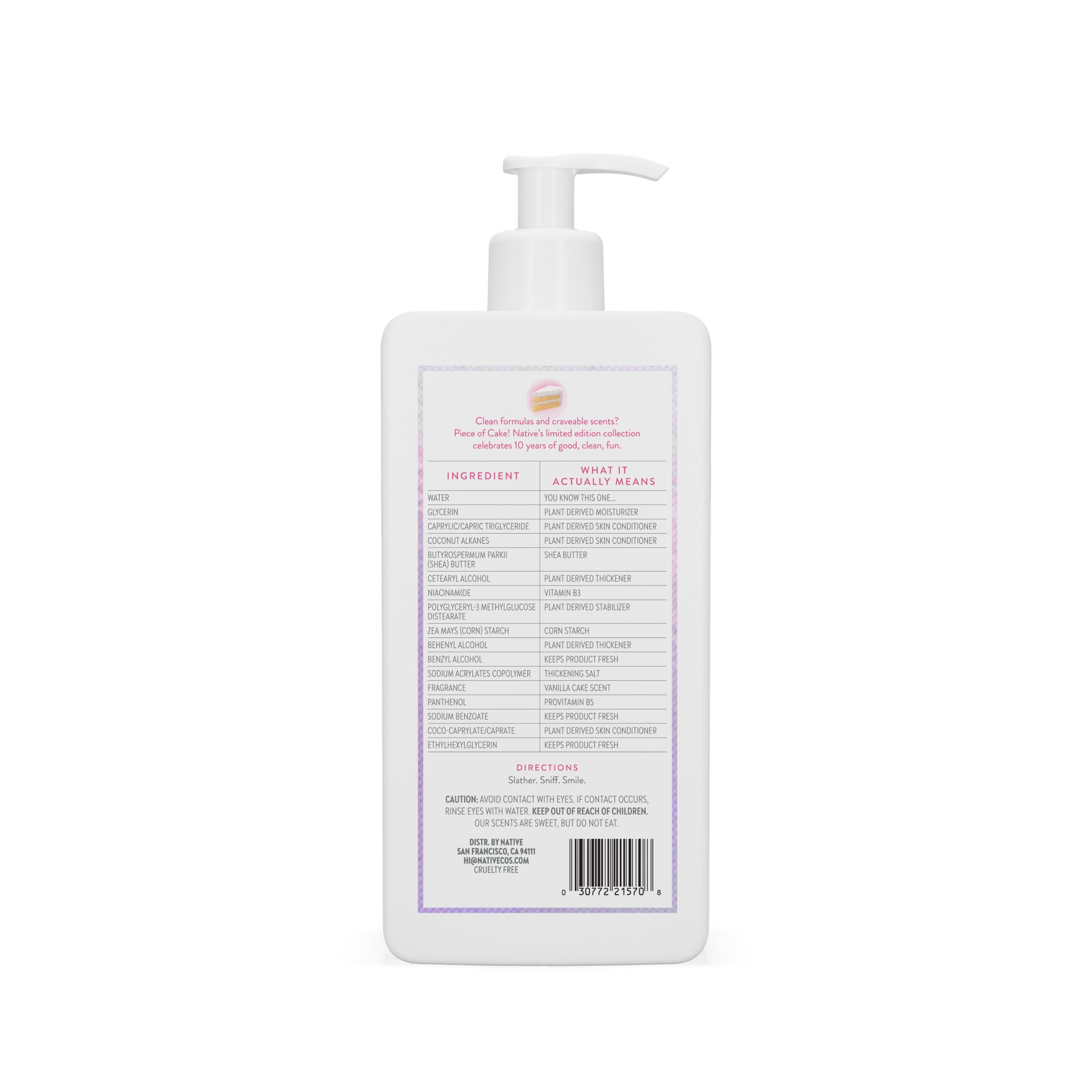 Water, Glycerin, Caprylic/Capric Triglyceride, Coconut Alkanes, Polyglyceryl-3 Methylglucose Distearate, Niacinamide, Cetearyl Alcohol, Butyrospermum Parkii (Shea) Butter, Zea Mays (Corn) Starch, Behenyl Alcohol, Benzyl Alcohol, Fragrance, Sodium Acrylates Copolymer, Panthenol, Sodium Benzoate, Coco-Caprylate/Caprate, Ethylhexylglycerin.