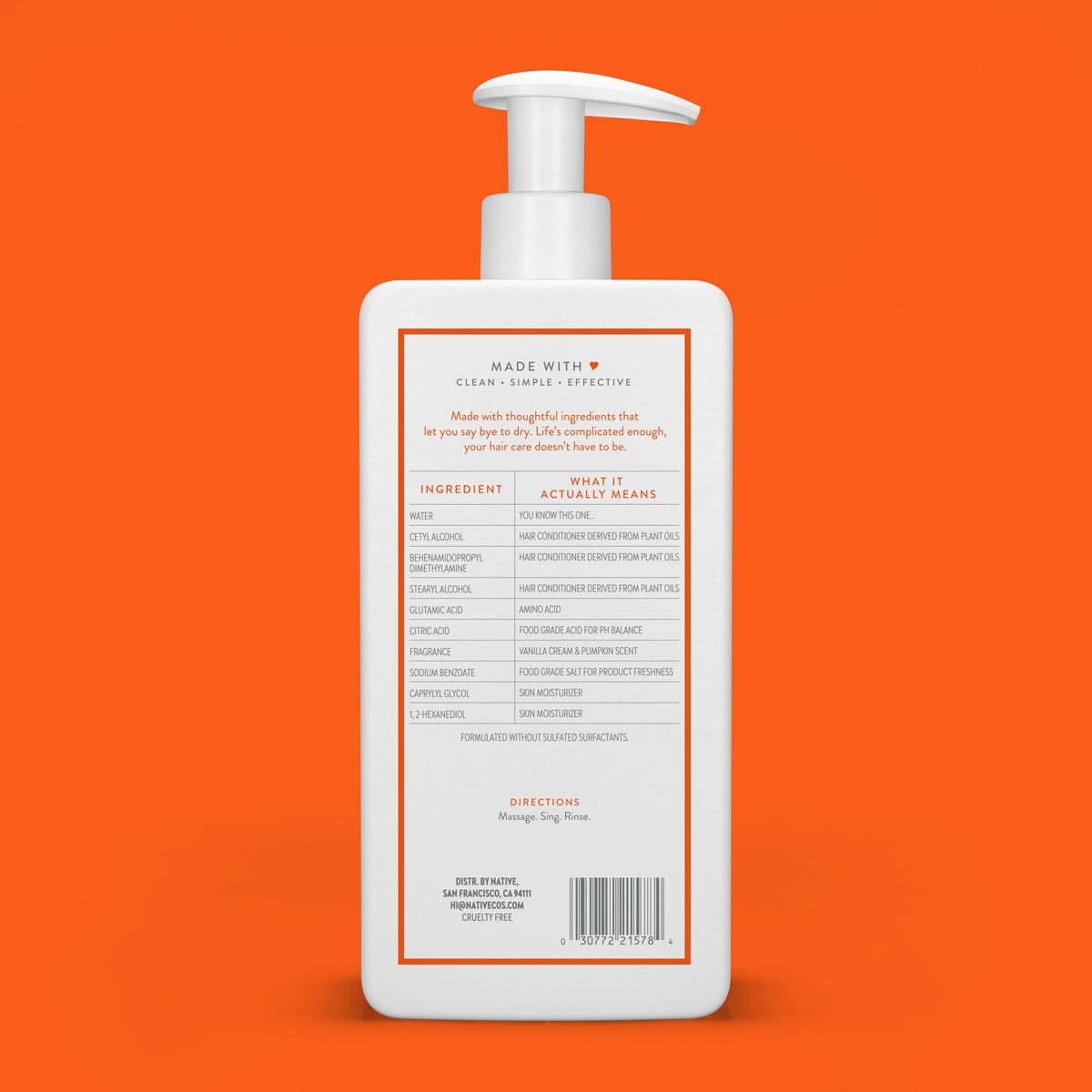 Water, Cetyl Alcohol, Behenamidopropyl Dimethylamine, Stearyl Alcohol, Glutamic Acid, Citric Acid, Fragrance, Sodium Benzoate, Caprylyl Glycol, 1, 2-Hexanediol.