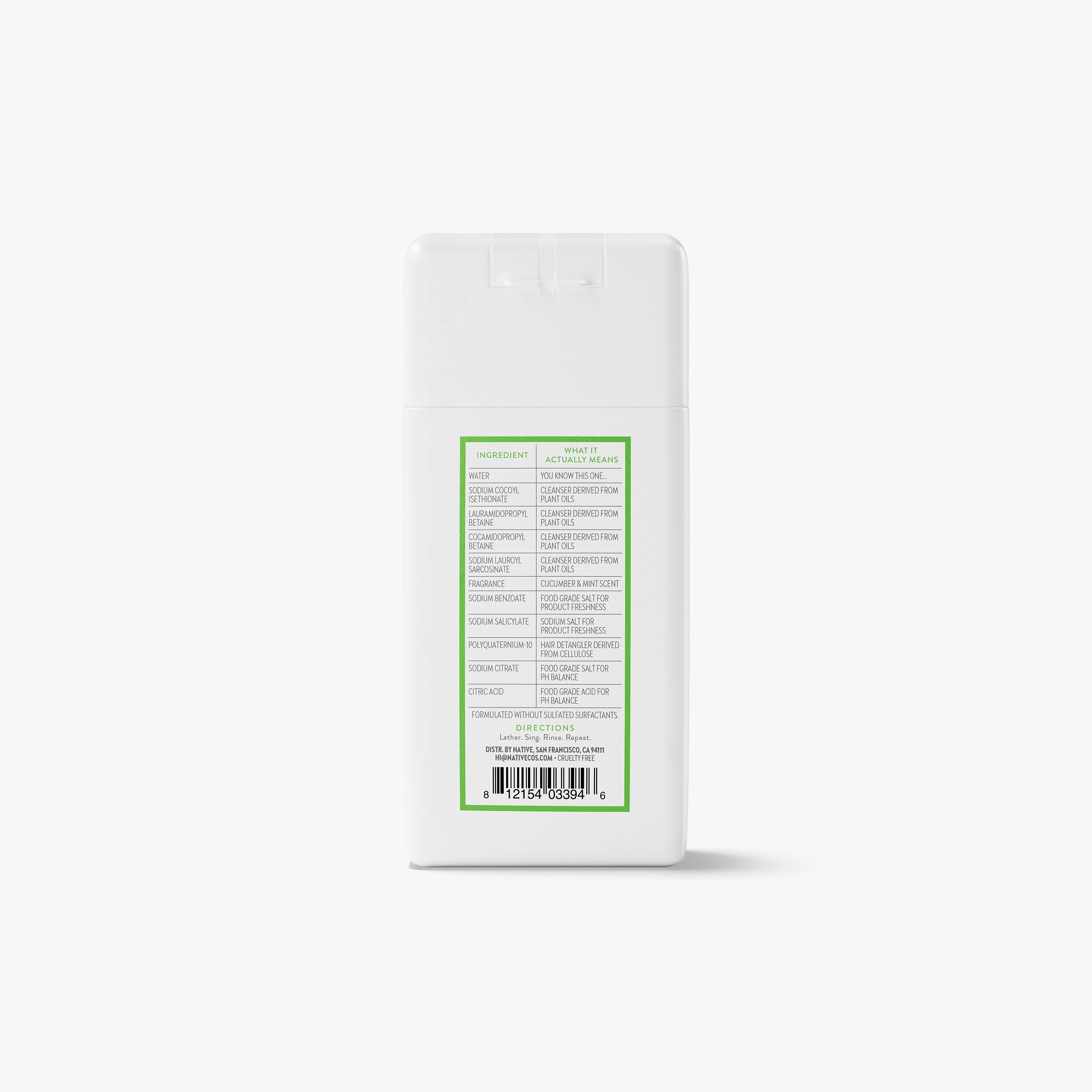 Water, Sodium Cocoyl Isethionate, Lauramidopropyl Betaine, Cocamidopropyl Betaine, Sodium Lauroyl Sarcosinate, Fragrance, Sodium Benzoate, Sodium Salicylate, Polyquaternium-10, Sodium Citrate, Citric Acid.
